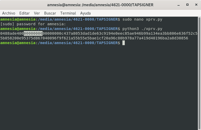 Ahora ya solo nos queda correr el comando python3 ./xprv.py y nos aparecerá en pantalla la clave privada extendida decodificada en hexadecimal.