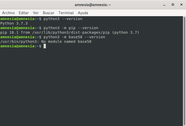 También podemos verificar si ya tiene instalada esa librería con python3 -m base58 --version pero lo más seguro es que nos diga que no: No module named base 58