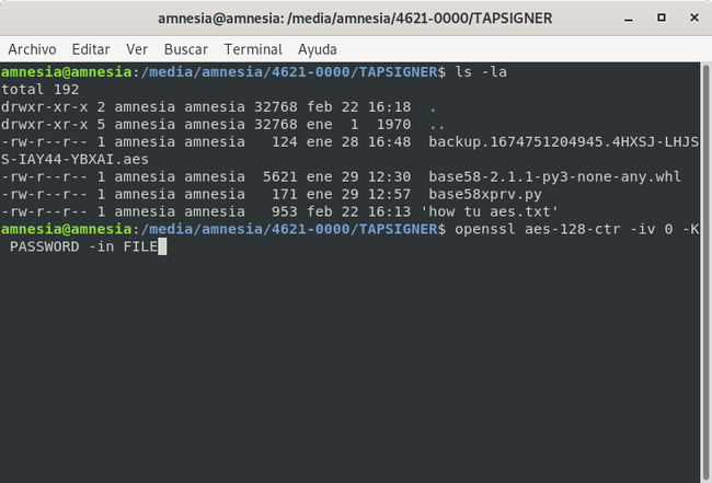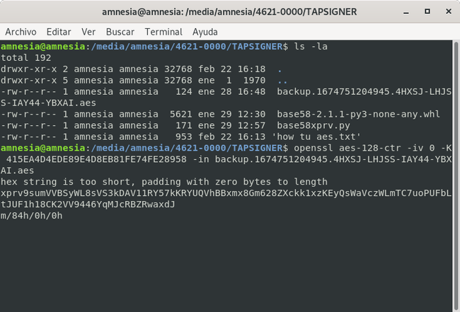 En esta explicación te voy a detallar cómo he verificado de forma segura el Backup cifrado en AES que puedes extraer de TAPSIGNER y su chain code (el código escogido manualmente en la inicialización).