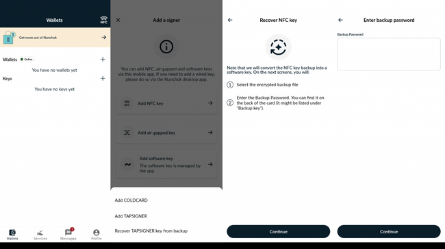 En una Nunchuk Wallet recién instalada, vamos a la pestaña de Wallets y le damos al símbolo '+' de la derecha de Keys.