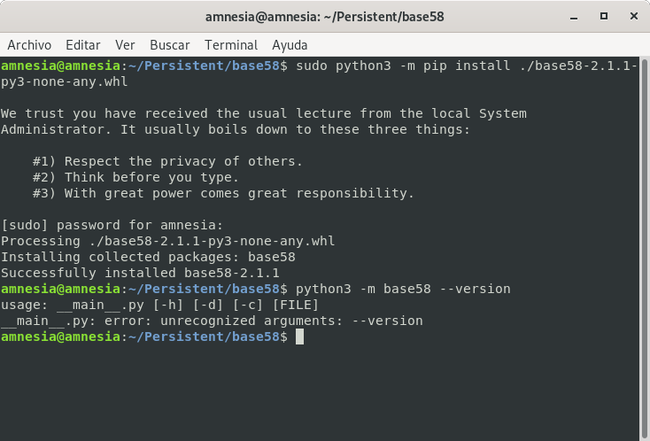 Si ahora volvemos a verificar la instalación de base58 con python3 -m base58 --version, ya no nos sale lo de No module